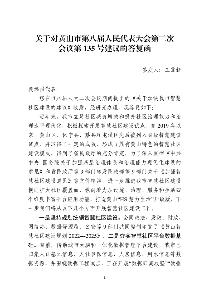 关于对黄山市第八届人民代表大会第二次会议第135号建议的答复函
