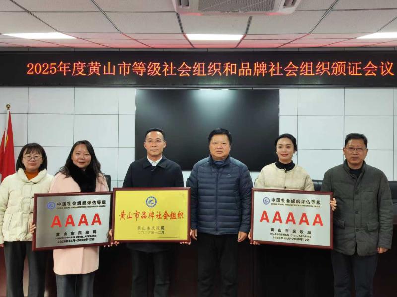 会议通报了2025年度黄山市社会组织评估等级和品牌社会组织认定结果,对获评的黄山市消防协会、黄山市导游员协会、黄山市物流协会等社会组织表示祝贺,对其在规范运作、服务行业、发挥作用等方面取得的突出成绩予以肯定,并为其颁发牌匾和证书。